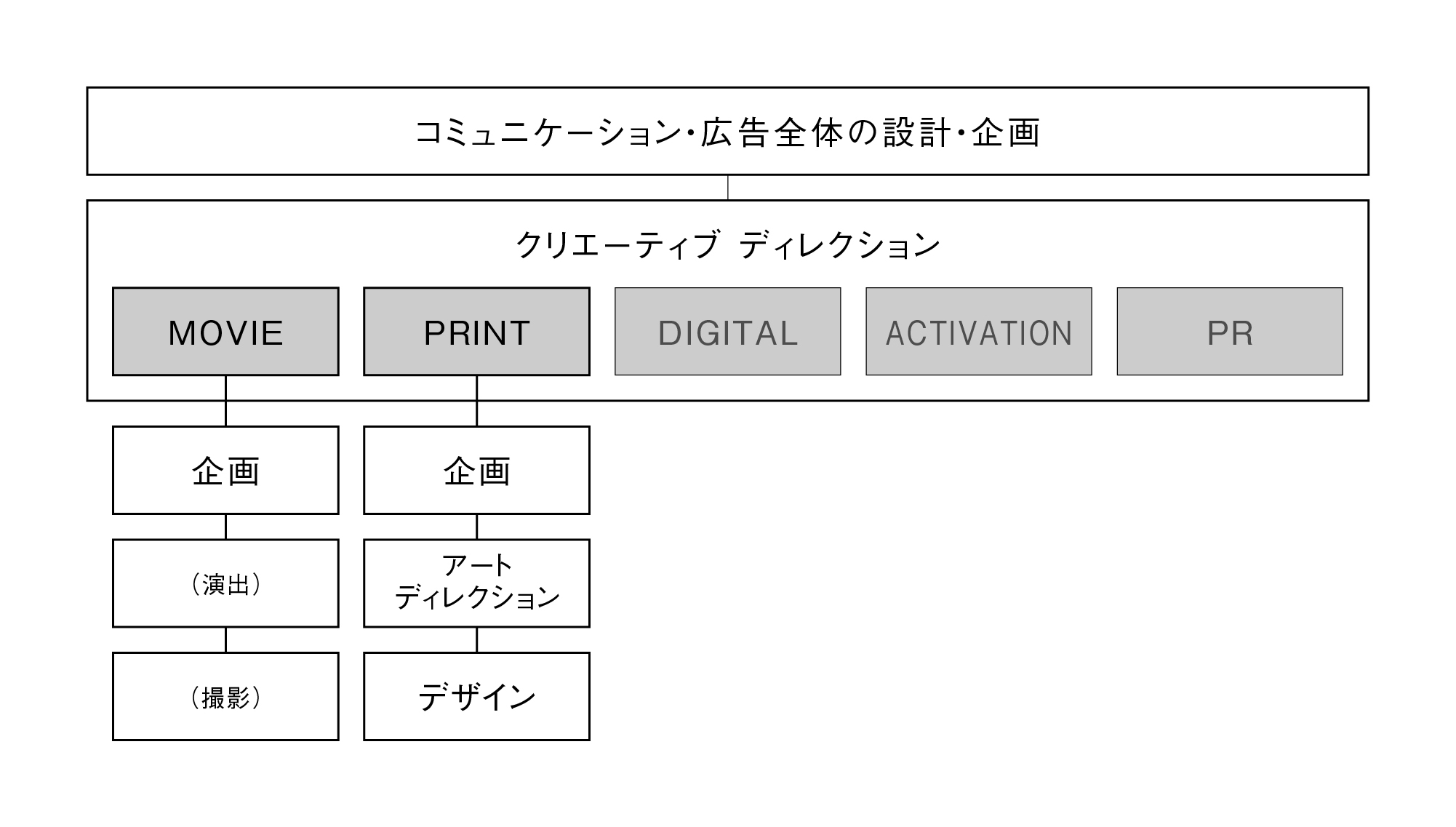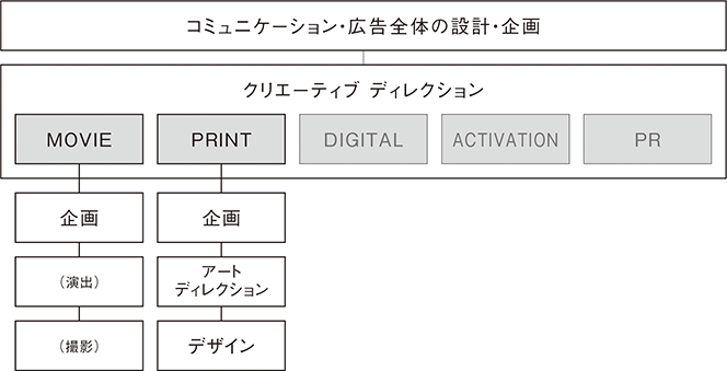 企画からプレゼン・定着・納品までの全てに対応。いろんなアイデア出し。クライアント、営業職のみなさんからのお悩み相談。企画のみ、グラフィックのみ、CMだけ、どんなことにでも笑顔で対応。深夜の不安定な気分の時に吐き出したくなる愚痴電話の聞き役。スタッフィング。ロケハン・撮影現場・編集・試写の立会。メイキング制作。プロダクションとの各種調整。差し入れ。なぜか上手く行っていないときの各所揉みほぐし。一旦「ええんちゃうかな」と言う。お金がない時の撮影と編集。俗に言う地べたを這うようなこと。怒ってる人に対して、矢面に立たされて謝る。それって営業の仕事じゃないか…と思えるような、物分りの悪い人への説明代行。伝わるまで繰り返し言う。プリント、デジタル、小物、企画書、ありとあらゆるデザインとレイアウト。プリントアウトのソート・クリップ留め。デジタルチーム、アクティベーションチーム、PRチームなどを孤立させない空気づくり。「◯◯さんがなんか変なこと言ってます」といったときに一緒になって聞き流す、なんとなくやり過ごす。グラフィックチームとCMチームの香盤奪い合い調整。空気が悪い時に率先して笑う。困ってる人と一緒に飲む。結局うまくいって一緒に飲む。など、とても便利に使えます。
